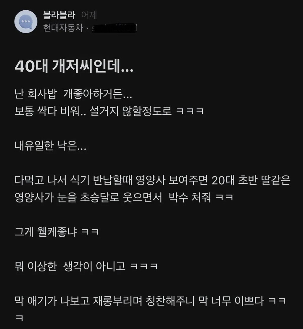 구내식당 영양사가 예뻐 죽겠다는 40대 현대차 개저씨