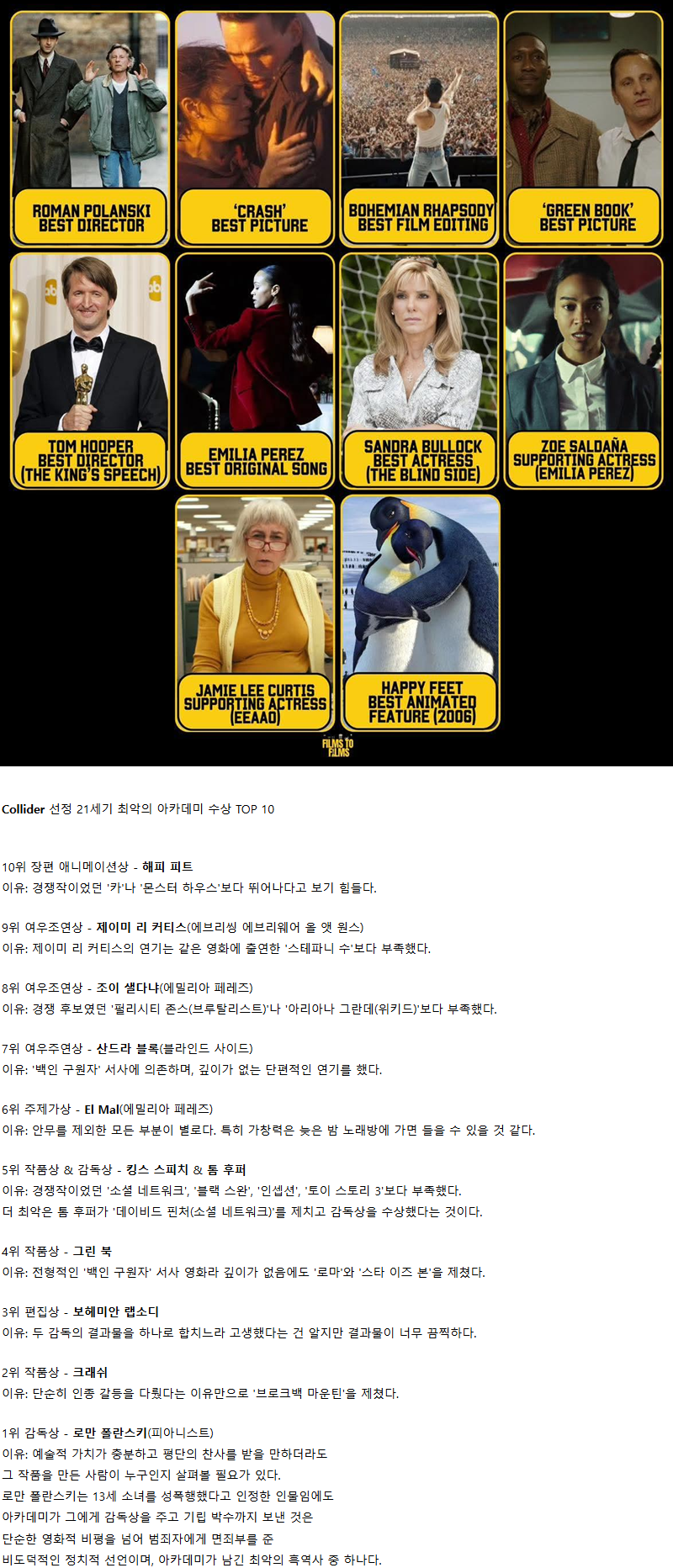 해외 매체 선정 21세기 최악의 아카데미 수상 TOP 10