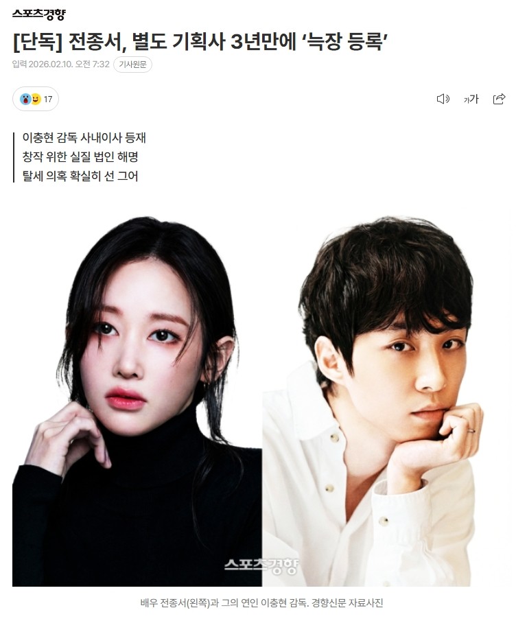 배우 전종서도 1인 기획사 의혹 터짐