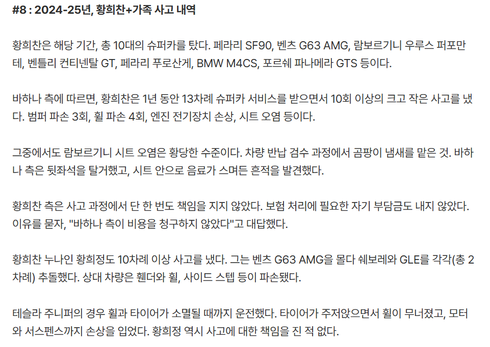 2024-25년 황희찬 및 가족이 낸 슈퍼카 사고 내역