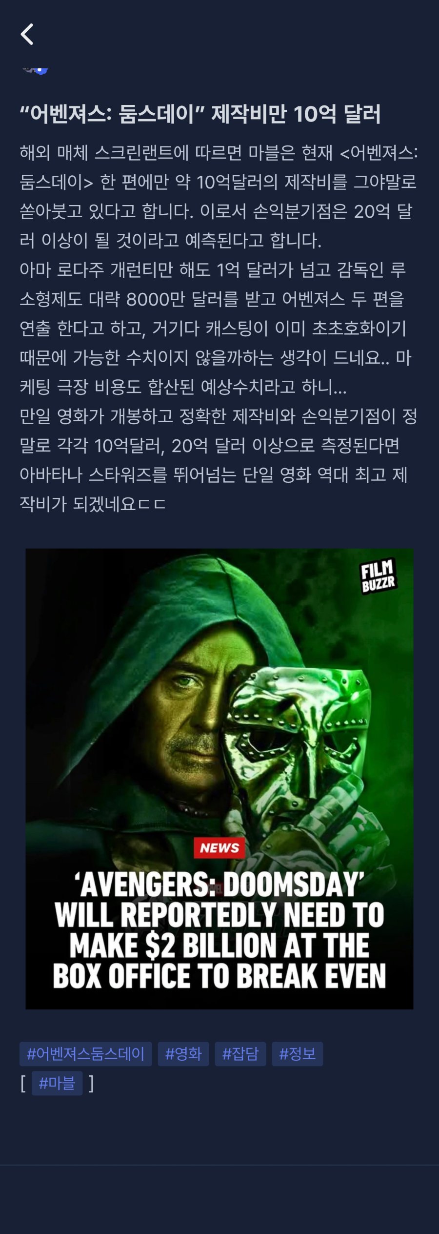 "어벤저스 : 둠스데이" 제작비만 10억 달러