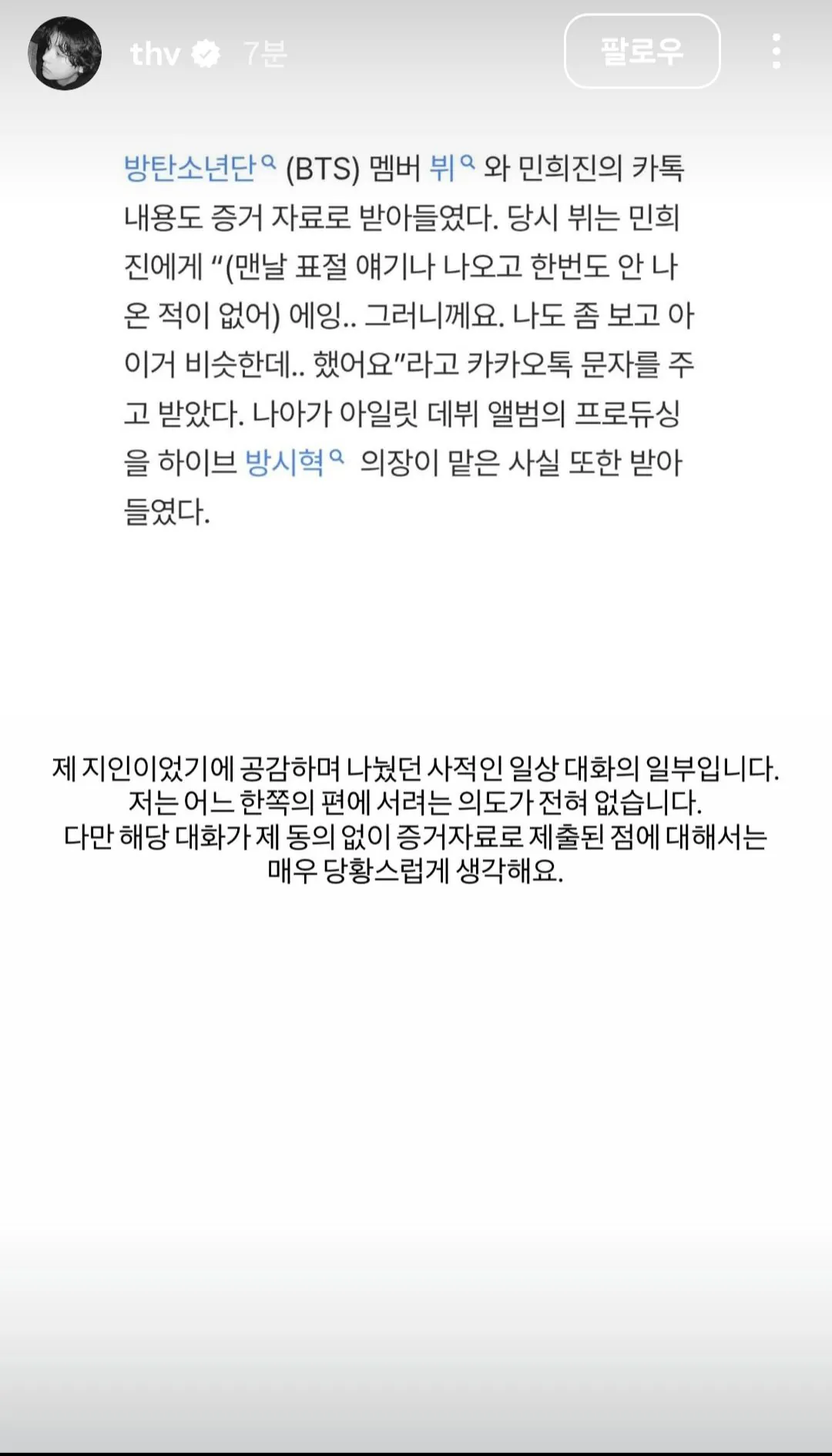 민희진 사건 관련 방탄소년단 뷔 인스타 입장표명