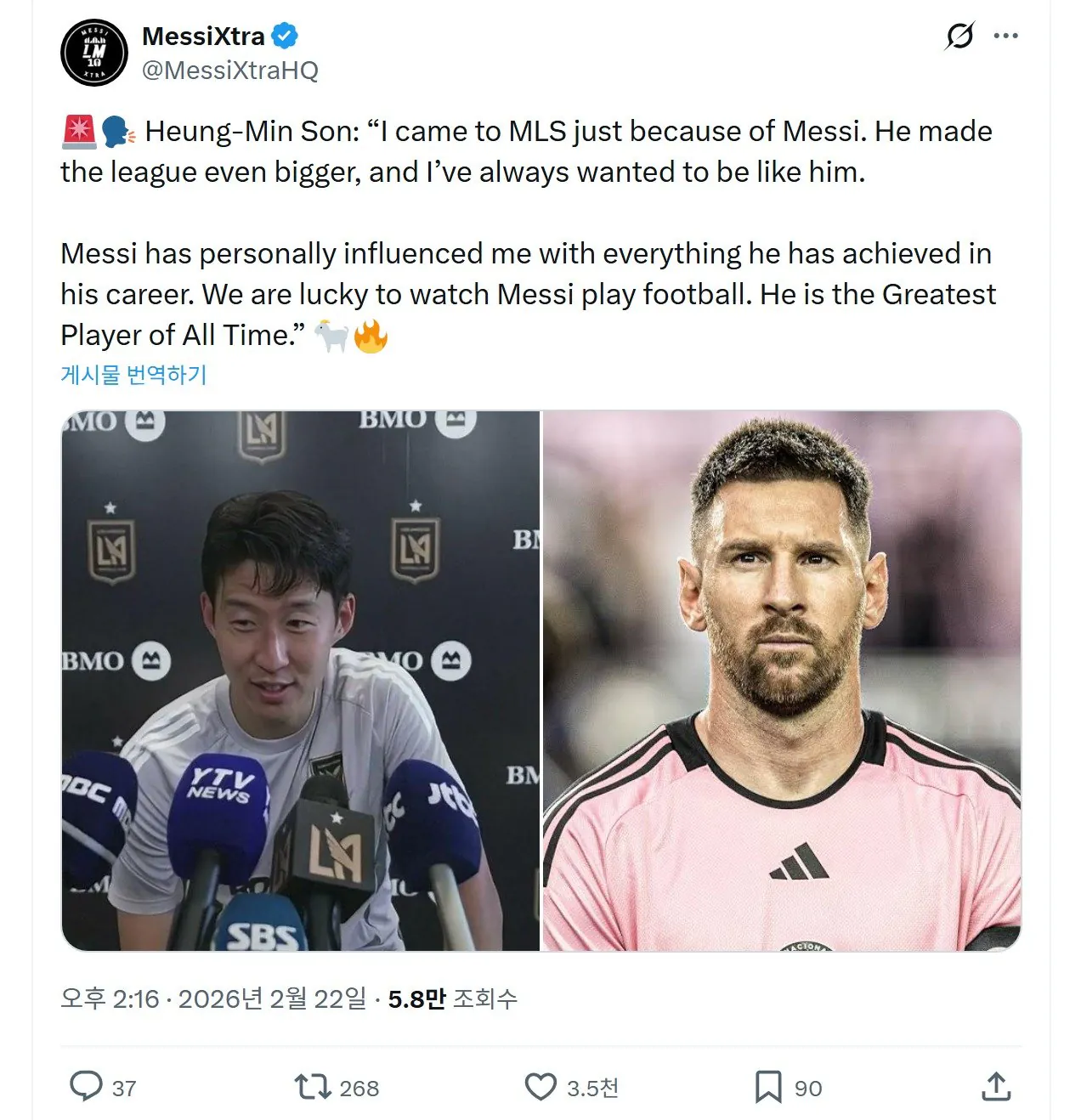 오늘자 손흥민 : 메시가 역대 최고의 선수다.