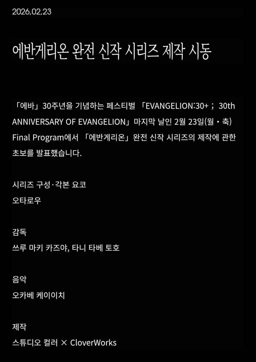 에반게리온, 완전 신작 시리즈 제작 발표