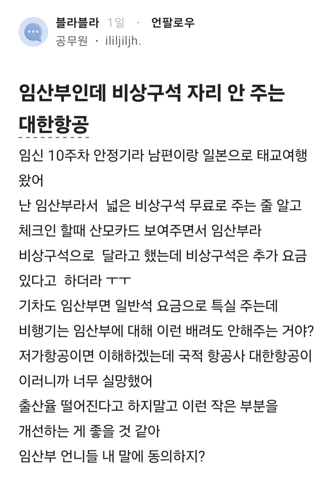 임산부인데 비상구석 자리 안 주는 대한항공