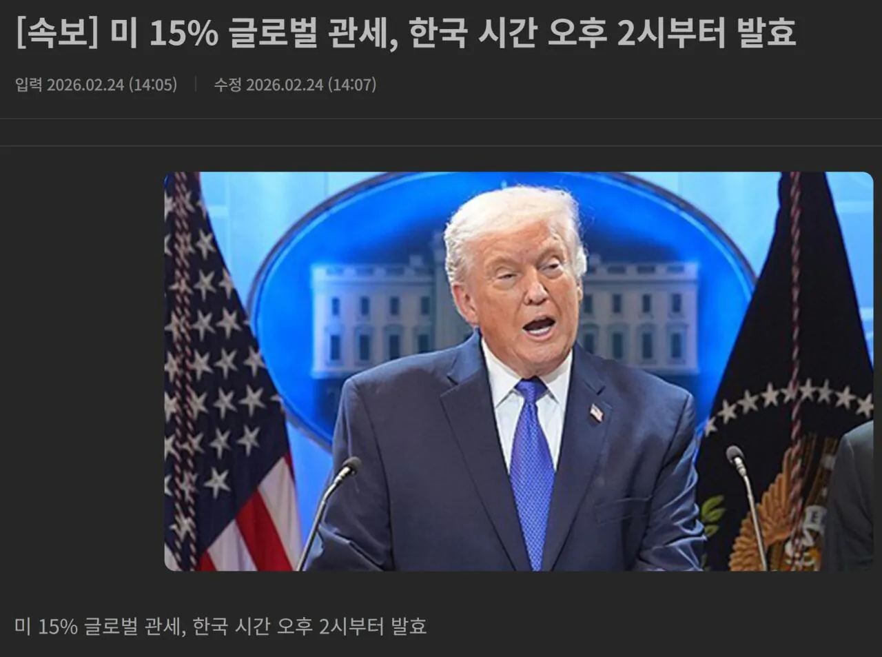 [속보] 미 15% 글로벌 관세, 한국 시간 오후 2시부터 발효